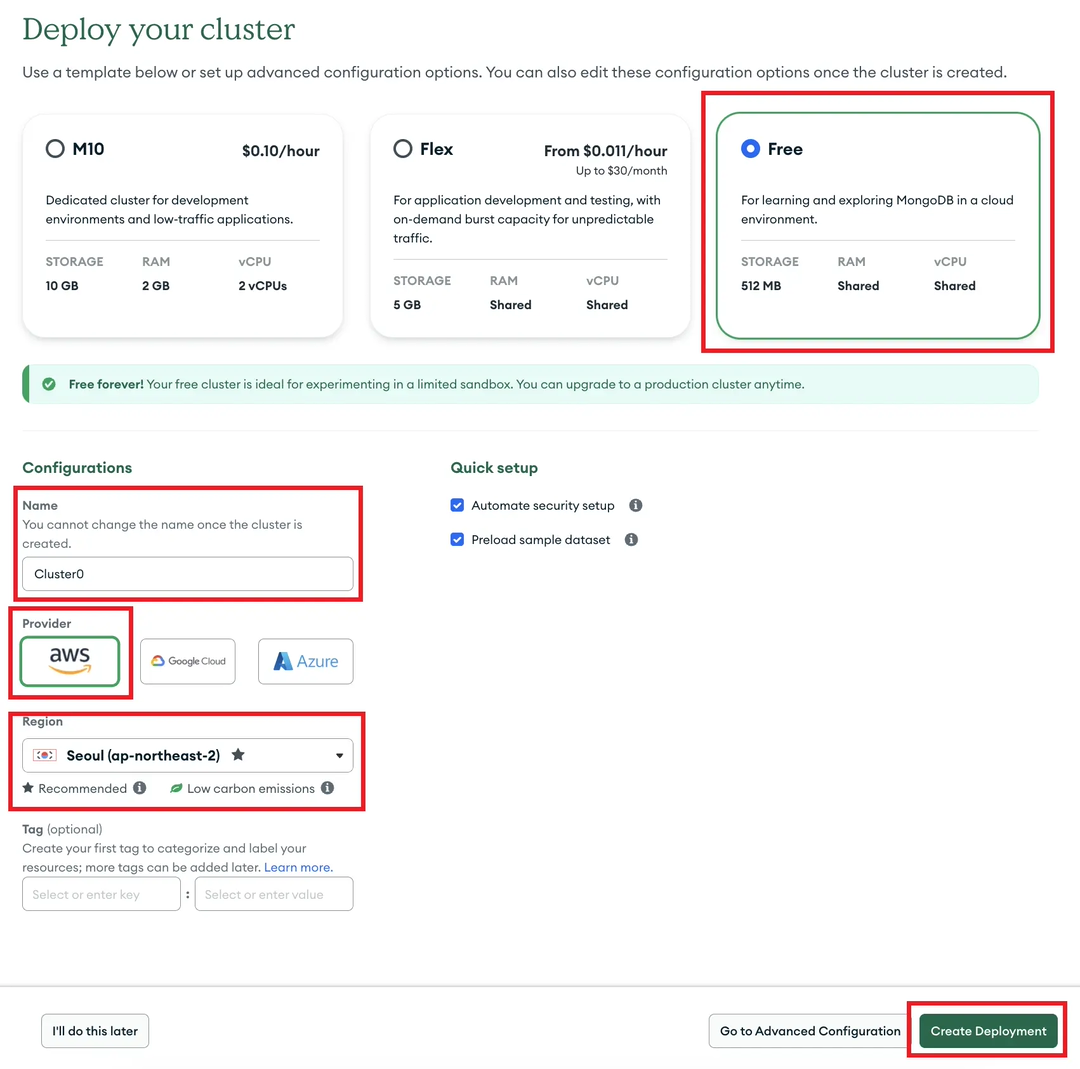 ap-northeast-2 (서울), GCP의 asia-northeast3 (서울)). 무료 티어는 선택 가능한 리전이 제한될 수 있습니다.MyFirstAtlasCluster). 기본 이름(Cluster0 등)을 사용해도 무방합니다.